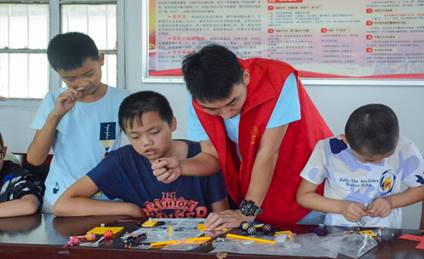 志愿者们划分队伍一对一结对深入地去了解陪伴孩子。志愿者们组织手工课、环保课、自我保护课。通过游戏、表演坏人与好人的形式浅显易懂的向孩子们传达自我保护意识,通过跟孩子们在道路上捡瓶子和家里废弃的塑料制作孩子们喜欢的小东西向孩子们传达环境保护意识,志愿者们还带来了在大学里自己用生活垃圾制作的汽车模型,引起了孩子们无限好奇,孩子们玩的很认真,也在不知不觉中收获了知识和快乐。
