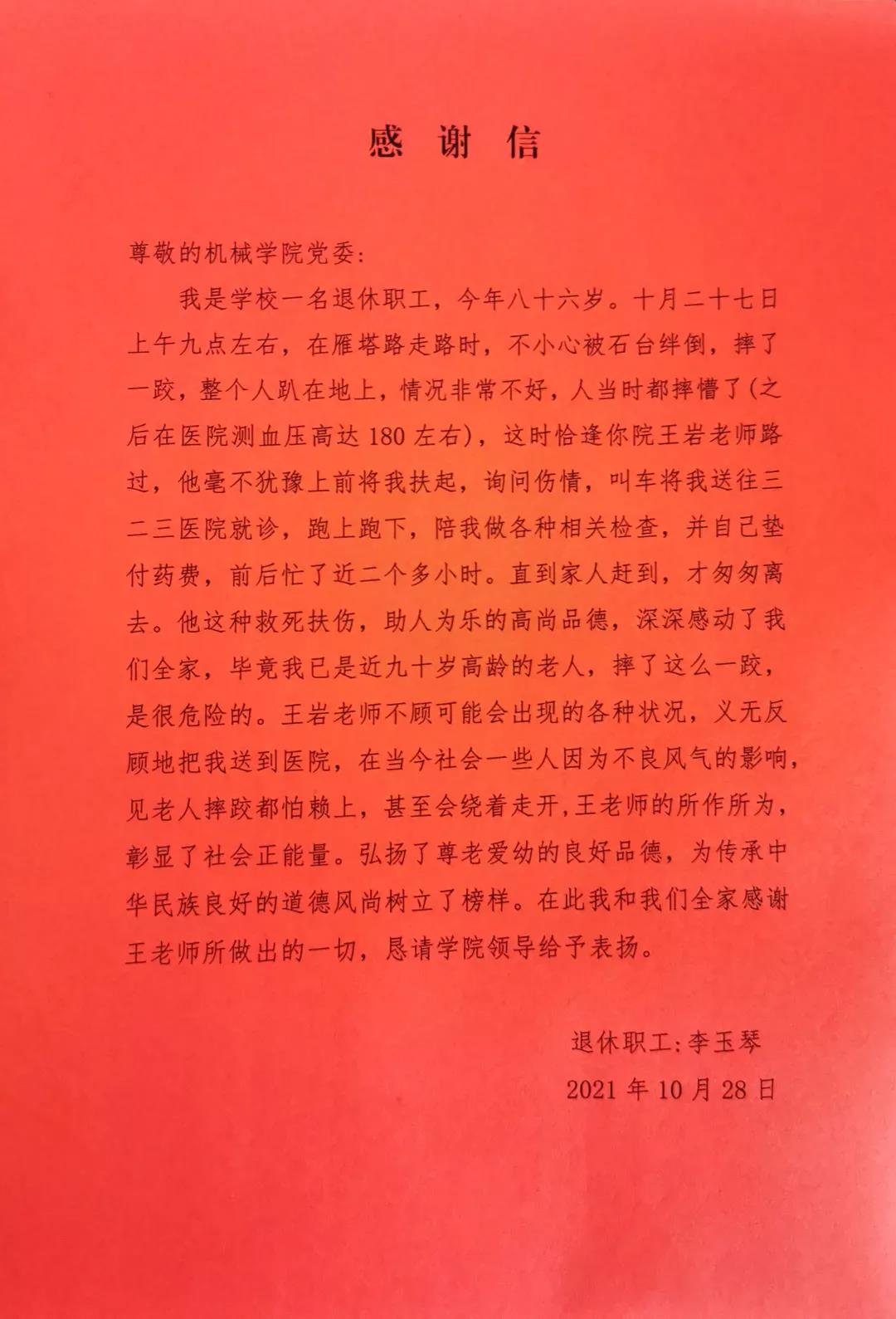 11月3日,必赢76net线路官网党委收到一封来自退休职工的感谢信。八十六岁高龄的李奶奶在信中讲述了必赢官网机械电子系青年教师王岩偶遇她不慎摔跤时给予无私帮助的前后经过。