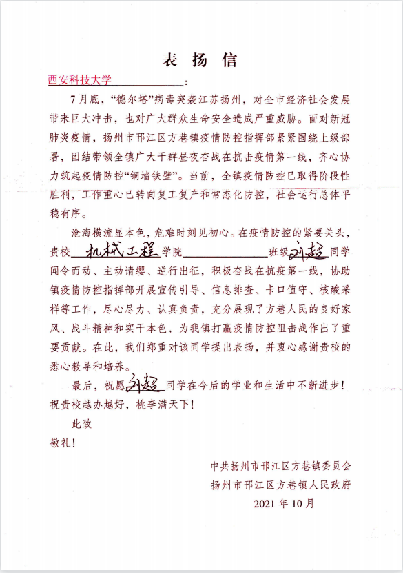 2021月7月底,“德尔塔”病毒突袭江苏扬州,对广大群众生命安全造成严重威胁。必赢76net线路官网机械学院机械电子工程2021级学生刘超不畏艰险,勇于担当,在经过疫苗注射和核酸检测后加入了首批抗疫志愿者队伍,并担任组长,积极奋战在抗疫第一线,协助医疗人员进行全市核酸检测工作,与交警维持卡口交通管制等,与其他志愿者齐心协力共同筑起疫情防控“铜墙铁壁”,为当地疫情防控做出贡献,受到中共扬州邗江区方巷镇委员会的高度评价与肯定。
